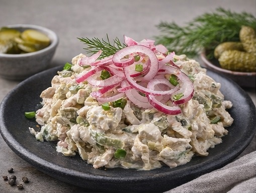 Салат «Буржуйский» — идеальное сочетание нежной свинины, пикантных маринованных огурчиков, свежего красного лука и аппетитного соуса. Простое, сытное и невероятно вкусное блюдо, которое понравится даже самому требовательному гурману.