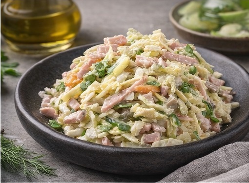 Салат «Каприз» — изысканное сочетание ветчины, хрустящей пекинской капусты, яиц, сыра и соленых огурцов, заправленное нежным майонезом. Этот легкий и питательный салат подарит вам заряд бодрости и хорошее настроение.