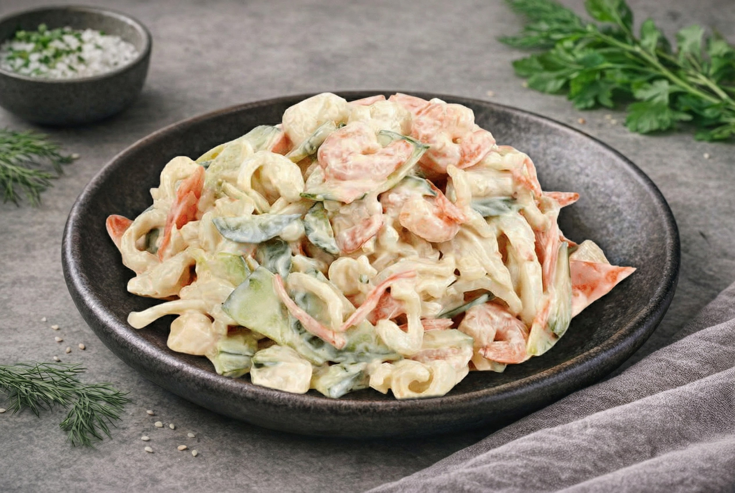 Салат «Морской» — настоящий праздник вкуса и пользы! Нежные кальмары, ароматные креветки, хрустящие огурчики, питательные яйца и пикантная нотка крабовых палочек — всё это соединено лёгким майонезом, создавая идеальный баланс свежести и насыщенности.