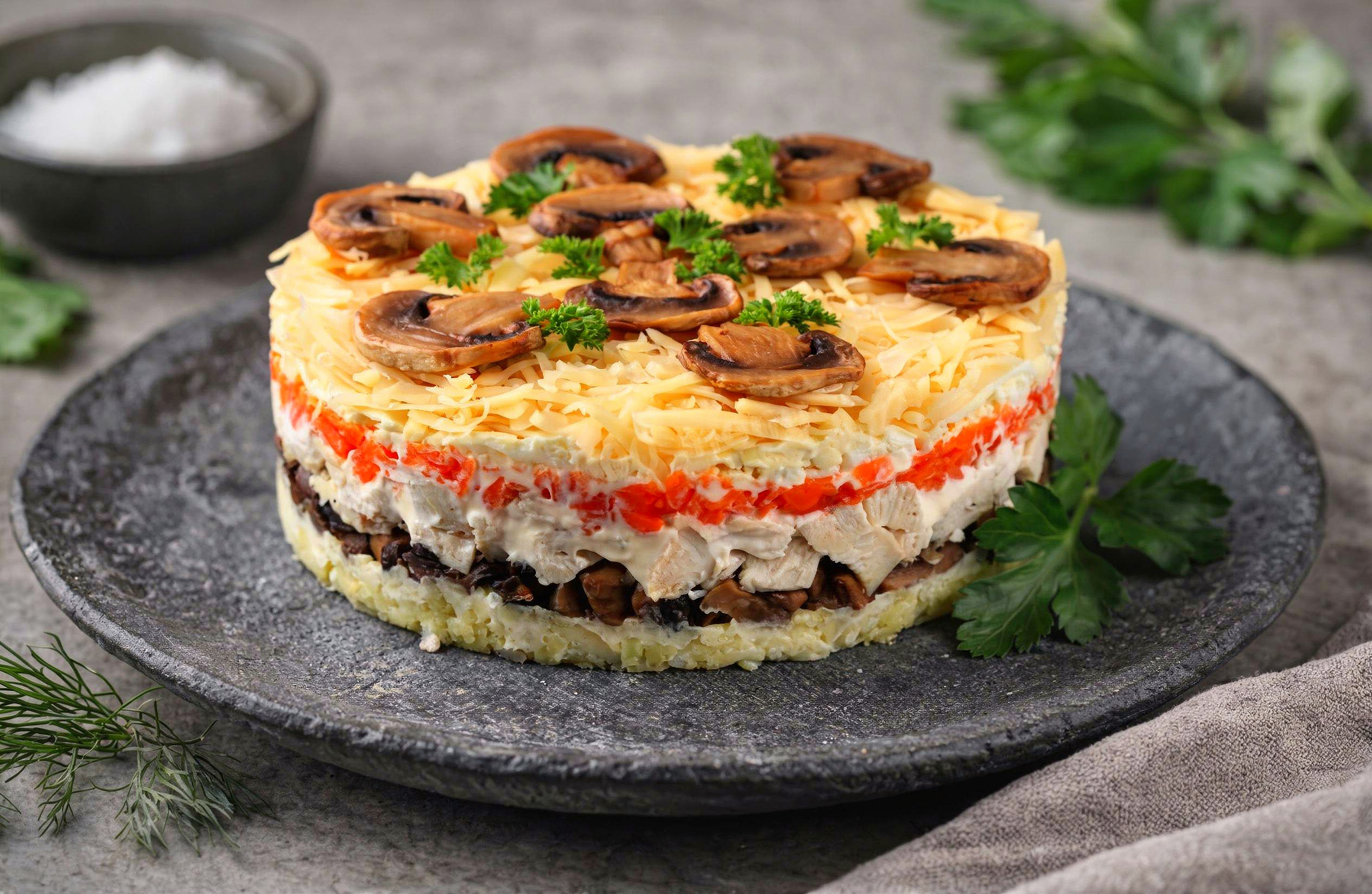 Салат «Петроградский» — идеальное блюдо для любителей традиционных вкусов. Нежное куриное филе, ароматные грибы, яйца, картофель, морковь и сыр, заправленные нежнейшим майонезом, создают гармоничную композицию, богатую белками и полезными микроэлементами.
