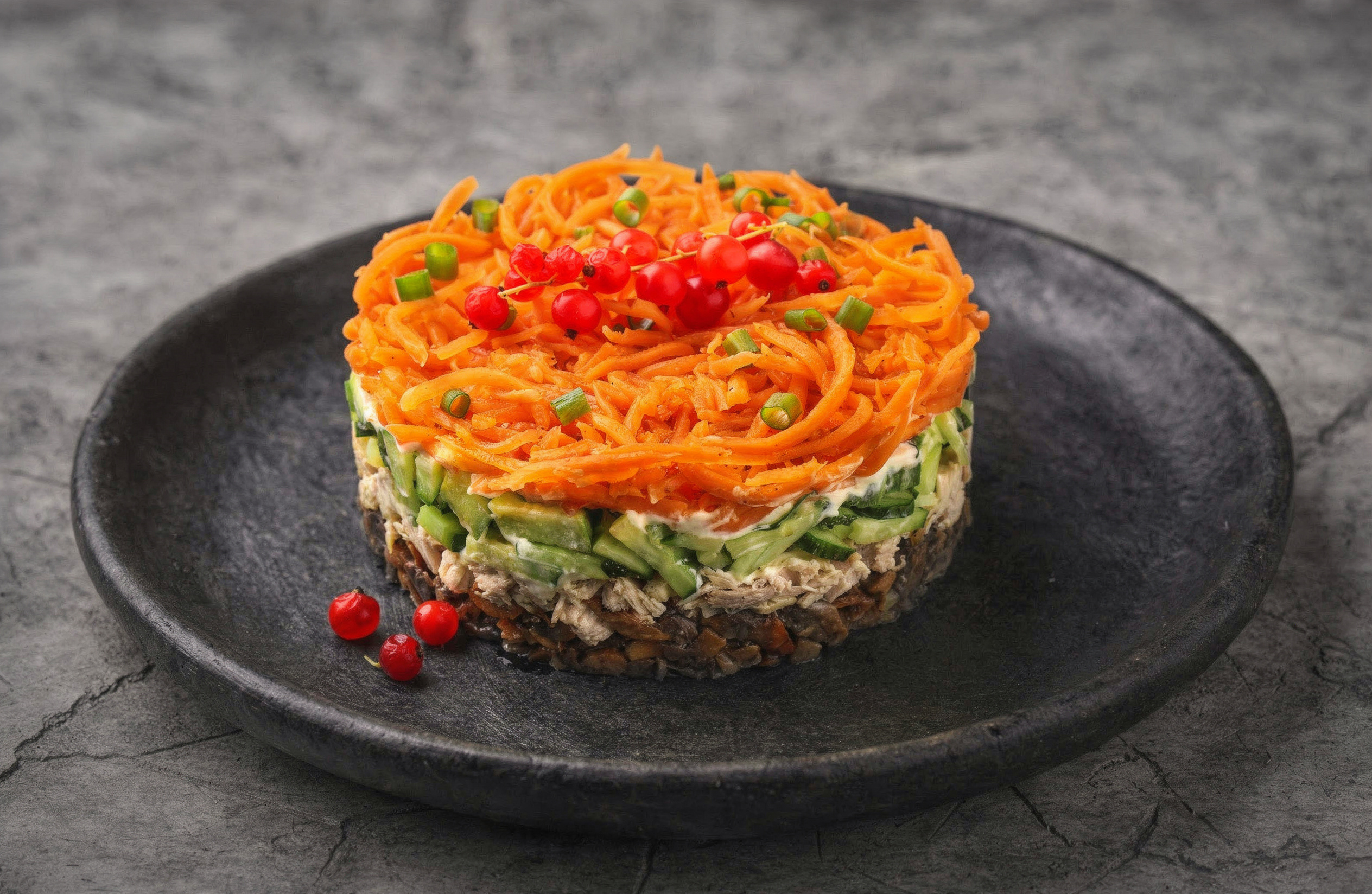 (говядина отв., морковь по-корейски, сыр, яйцо, шампиньоны, майонез)